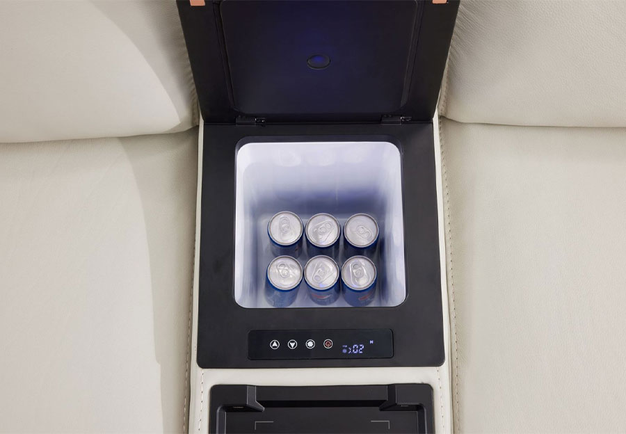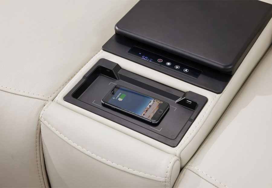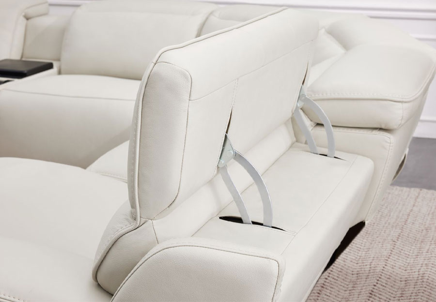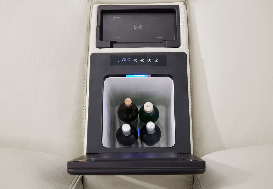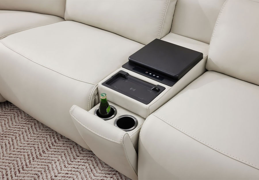 Revel in next-level relaxation with the ultra-modern Regis leather power reclining sectional. Clean, architectural lines are softened by gently flared pillow-top arms and rich leather upholstery, creating a refined contemporary statement. Plush foam-and-fiber cushioning delivers exceptional comfort for everyday lounging or entertaining, while power recliners with adjustable headrests let you find your perfect position at the touch of a button. A thoughtfully designed console elevates convenience with a built-in refrigerator, wireless charging, cupholders, and USB ports-keeping drinks chilled, devices powered, and everything you need effortlessly within reach.