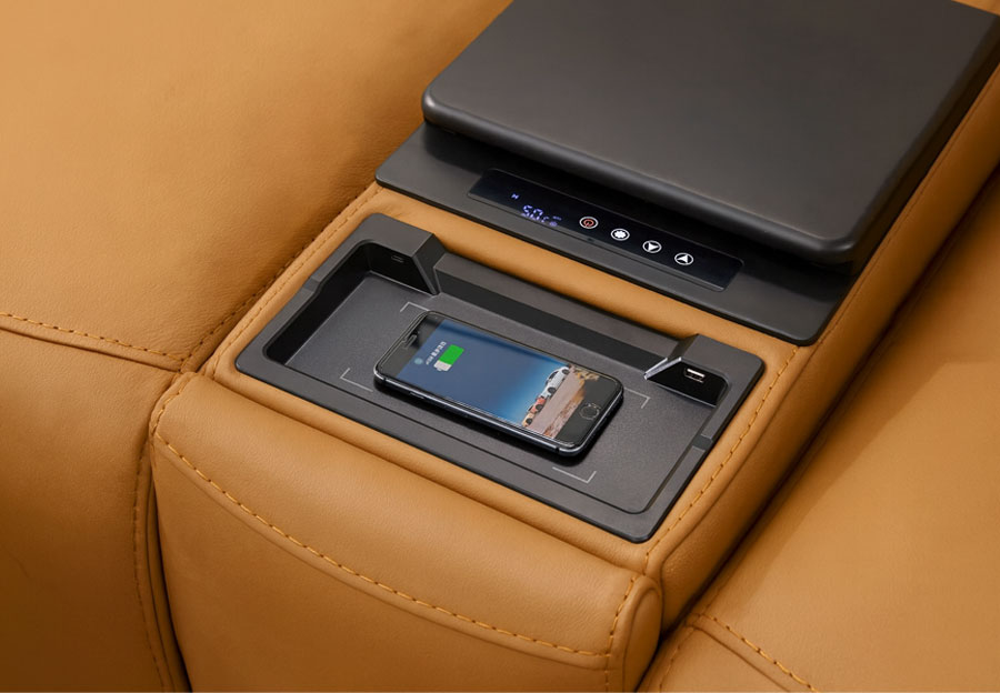 Revel in next-level relaxation with the ultra-modern Regis leather power reclining sectional. Clean, architectural lines are softened by gently flared pillow-top arms and rich leather upholstery, creating a refined contemporary statement. Plush foam-and-fiber cushioning delivers exceptional comfort for everyday lounging or entertaining, while power recliners with adjustable headrests let you find your perfect position at the touch of a button. A thoughtfully designed console elevates convenience with a built-in refrigerator, wireless charging, cupholders, and USB ports-keeping drinks chilled, devices powered, and everything you need effortlessly within reach.