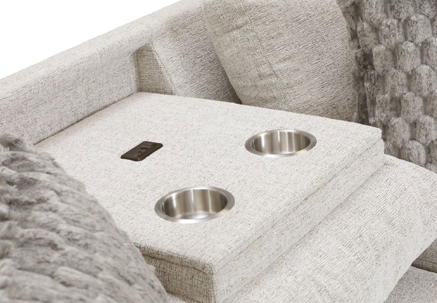 The Irving Collection blends soft sophistication with everyday comfort. Available in Cream or Charcoal, its upholstered in a rich textured fabric and accented with plush designer pillows for added depth and style. Built-in cupholders and USB ports bring modern convenience to its timeless design-elegant, inviting, and effortlessly livable.