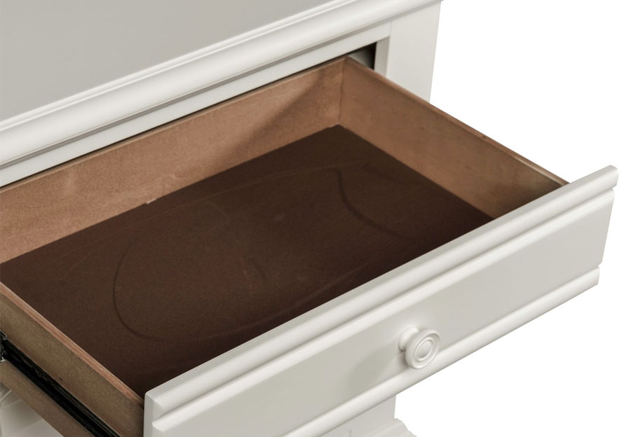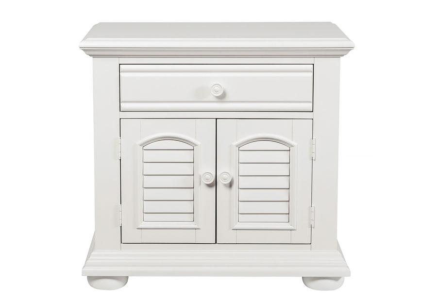 Obtain a fashionable cottage look with this 1 drawer, 2 door night stand. The oyster white finish is accented by louvered panels and wooden knob hardware. Storage abounds with the felt lined top drawer and adjustable shelf behind the two doors.