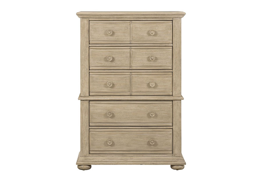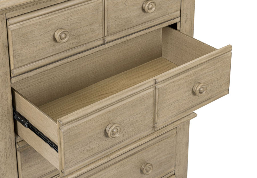 Obtain a fashionable cottage look with the summer house chest. Crafted with poplar and pine solids with wood products, this piece features 5 drawers, bottom case dust proofing, felt lined top drawers, and fully stained interior drawers. The natural finish is accented by wooden knob hardware.