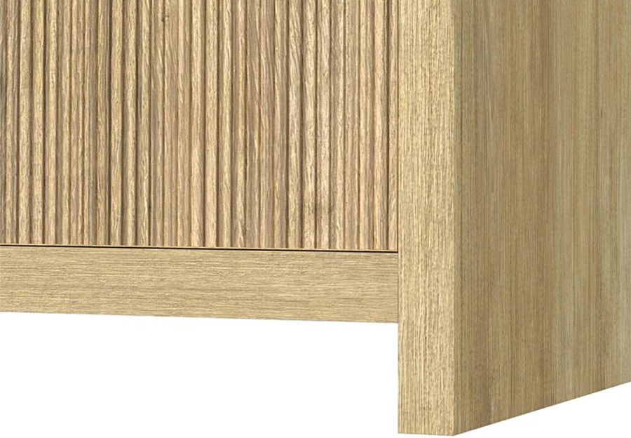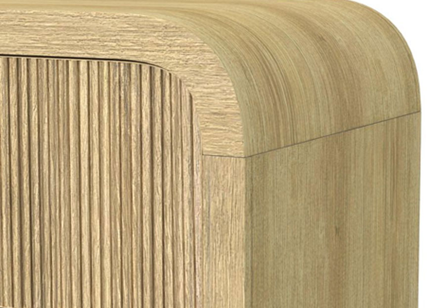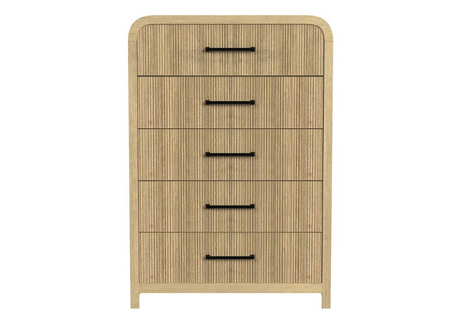 Transform your bedroom into a serene, modern retreat with the Ridgemont Collection. Showcasing a light wood finish with natural grain detailing, this set radiates warmth and style. Vertical reeding throughout adds texture and sophistication, while sleek, rounded edges provide a soft, inviting touch. The geometric cutout design on the headboard and footboard brings a contemporary flair. Spacious drawers, accented with bold black bar pulls, offer ample storage, including a USB port on the nightstand for convenient device charging. Clean, minimalist lines make this set the perfect complement to any modern decor. Elevate your space with effortless elegance.