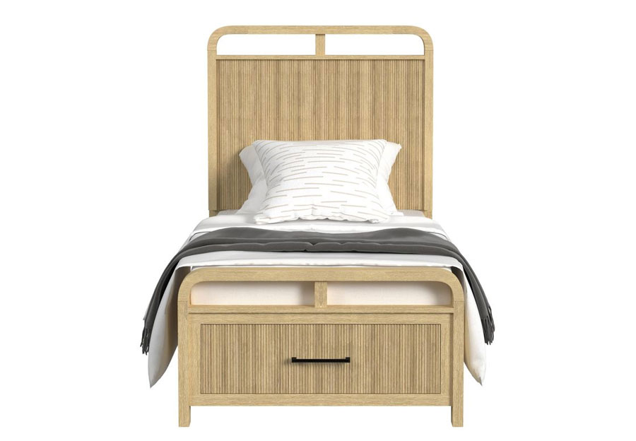 Transform your bedroom into a serene, modern retreat with the Ridgemont Collection. Showcasing a light wood finish with natural grain detailing, this set radiates warmth and style. Vertical reeding throughout adds texture and sophistication, while sleek, rounded edges provide a soft, inviting touch. The geometric cutout design on the headboard and footboard brings a contemporary flair. Spacious drawers, accented with bold black bar pulls, offer ample storage, including a USB port on the nightstand for convenient device charging. Clean, minimalist lines make this set the perfect complement to any modern decor. Elevate your space with effortless elegance.