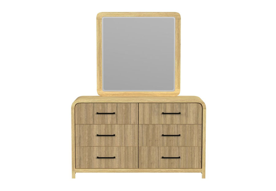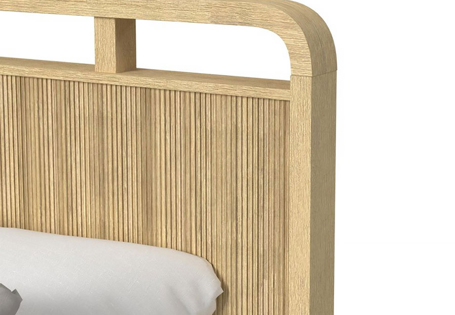 Transform your bedroom into a serene, modern retreat with the Ridgemont Collection. Showcasing a light wood finish with natural grain detailing, this set radiates warmth and style. Vertical reeding throughout adds texture and sophistication, while sleek, rounded edges provide a soft, inviting touch. The geometric cutout design on the headboard and footboard brings a contemporary flair. Spacious drawers, accented with bold black bar pulls, offer ample storage, including a USB port on the nightstand for convenient device charging. Clean, minimalist lines make this set the perfect complement to any modern decor. Elevate your space with effortless elegance.