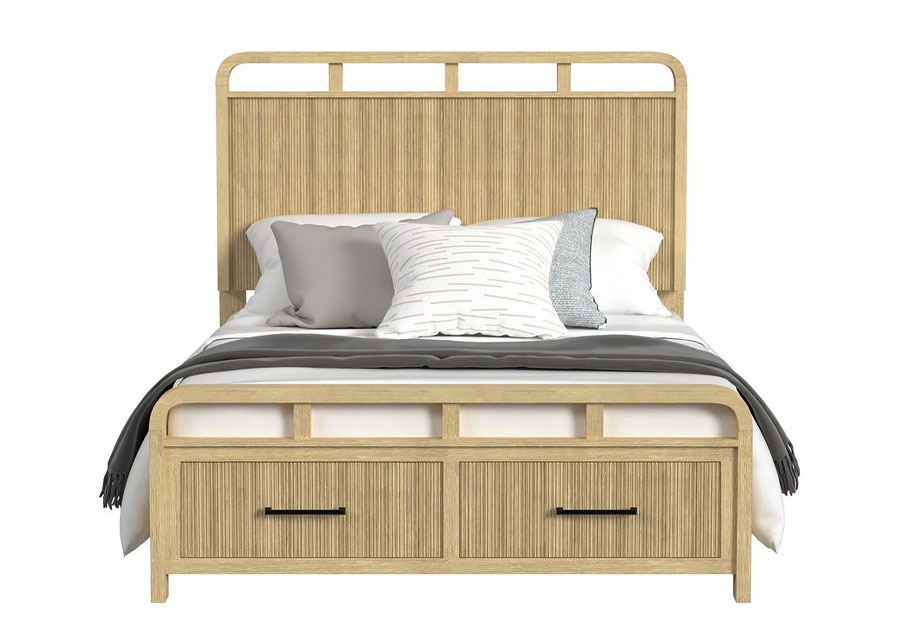Transform your bedroom into a serene, modern retreat with the Ridgemont Collection. Showcasing a light wood finish with natural grain detailing, this set radiates warmth and style. Vertical reeding throughout adds texture and sophistication, while sleek, rounded edges provide a soft, inviting touch. The geometric cutout design on the headboard and footboard brings a contemporary flair. Spacious drawers, accented with bold black bar pulls, offer ample storage, including a USB port on the nightstand for convenient device charging. Clean, minimalist lines make this set the perfect complement to any modern decor. Elevate your space with effortless elegance.