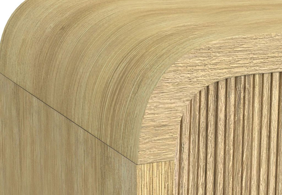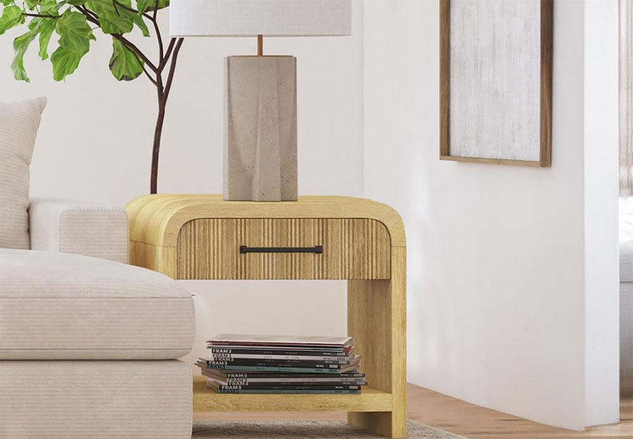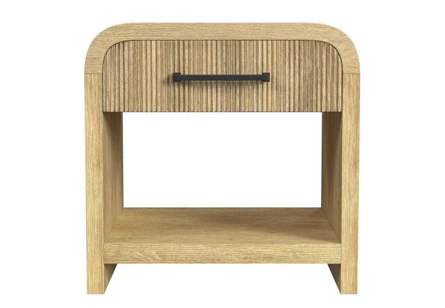Transform your bedroom into a serene, modern retreat with the Ridgemont Collection. Showcasing a light wood finish with natural grain detailing, this set radiates warmth and style. Vertical reeding throughout adds texture and sophistication, while sleek, rounded edges provide a soft, inviting touch. The geometric cutout design on the headboard and footboard brings a contemporary flair. Spacious drawers, accented with bold black bar pulls, offer ample storage, including a USB port on the nightstand for convenient device charging. Clean, minimalist lines make this set the perfect complement to any modern decor. Elevate your space with effortless elegance.