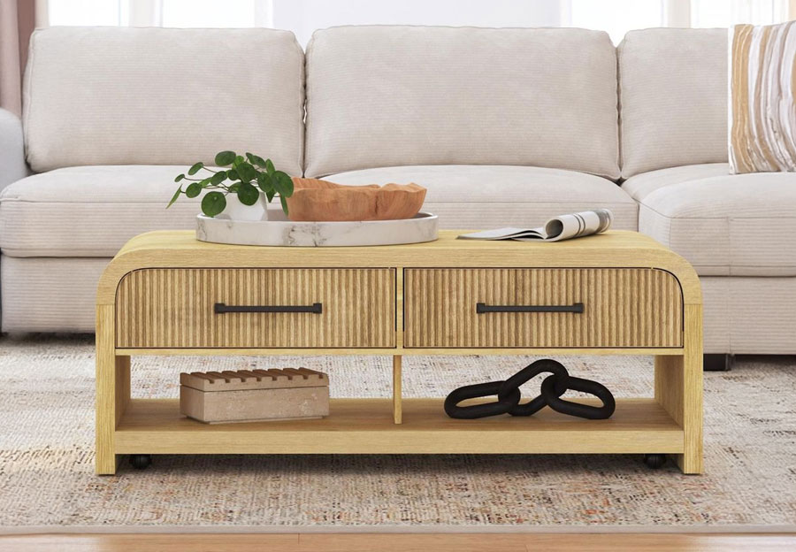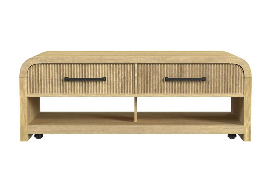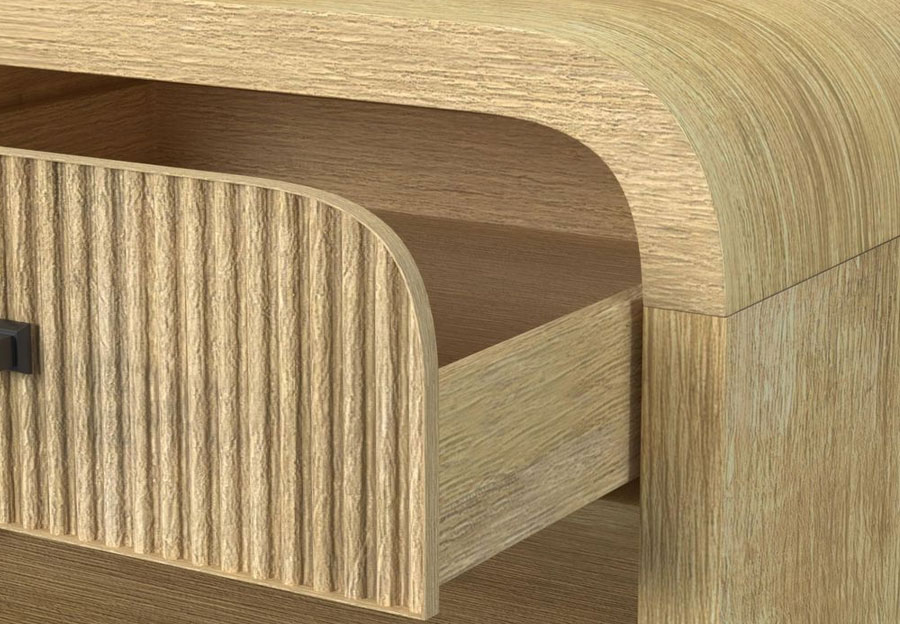 Transform your bedroom into a serene, modern retreat with the Ridgemont Collection. Showcasing a light wood finish with natural grain detailing, this set radiates warmth and style. Vertical reeding throughout adds texture and sophistication, while sleek, rounded edges provide a soft, inviting touch. The geometric cutout design on the headboard and footboard brings a contemporary flair. Spacious drawers, accented with bold black bar pulls, offer ample storage, including a USB port on the nightstand for convenient device charging. Clean, minimalist lines make this set the perfect complement to any modern decor. Elevate your space with effortless elegance.