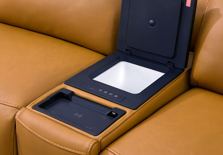 Revel in next-level relaxation with the ultra-modern Regis leather power reclining sectional. Clean, architectural lines are softened by gently flared pillow-top arms and rich leather upholstery, creating a refined contemporary statement. Plush foam-and-fiber cushioning delivers exceptional comfort for everyday lounging or entertaining, while power recliners with adjustable headrests let you find your perfect position at the touch of a button. A thoughtfully designed console elevates convenience with a built-in refrigerator, wireless charging, cupholders, and USB ports-keeping drinks chilled, devices powered, and everything you need effortlessly within reach.