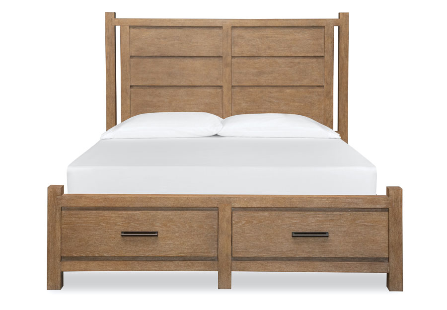 When it's time to rest and unwind, the Plum Creek bedroom collection offers seasonless style. It's clean lines and understated silhouettes convey ageless character designed to feel relevant for generations. A soft, natural Sierra brown finish shows off the beauty of Plum Creek's Random Cathedral Slip/ Flip White Oak veneers while Burnished Bronze hardware adds another layer of visual appeal. Dreamy bed options can be paired with smart storage pieces to create a custom look that evokes nature's soothing beauty.