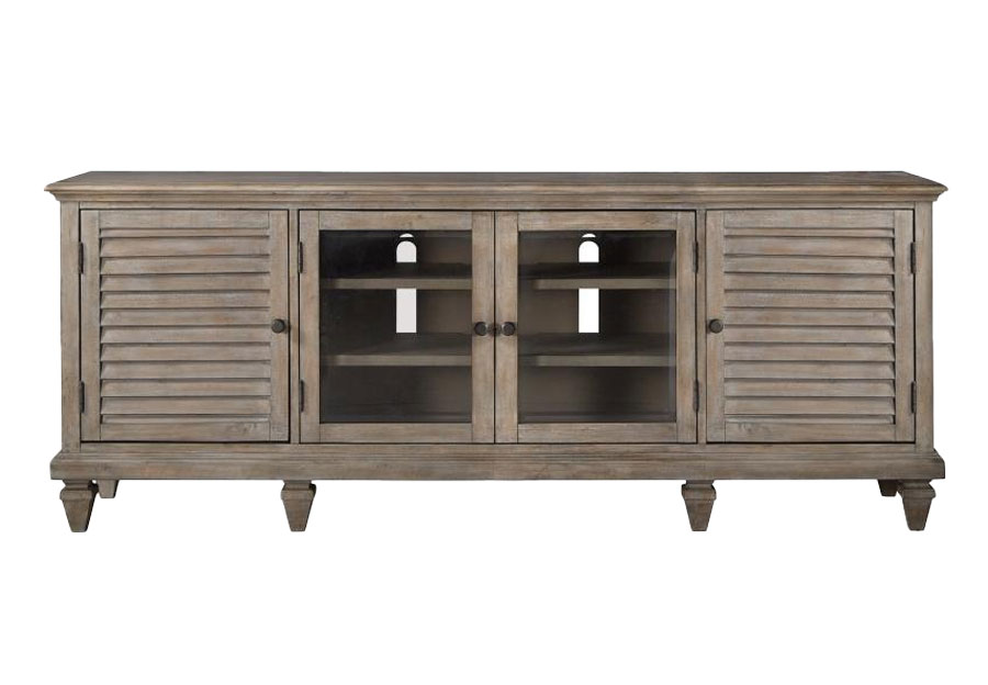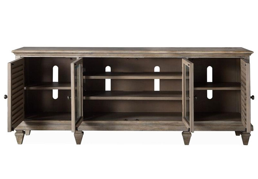 Refined design and casual, rustic appeal marry functionality to a T in Lancaster. Crafted of Pine solids with handsome beadboard like panels in an updated Dovetail Grey finish and accented by Weathered Bronze pulls, the fully equipped Lancaster is the ideal media solution. The media console makes the perfect standalone unit with glass center doors featuring expert wire management and two closed doors.