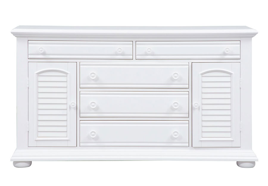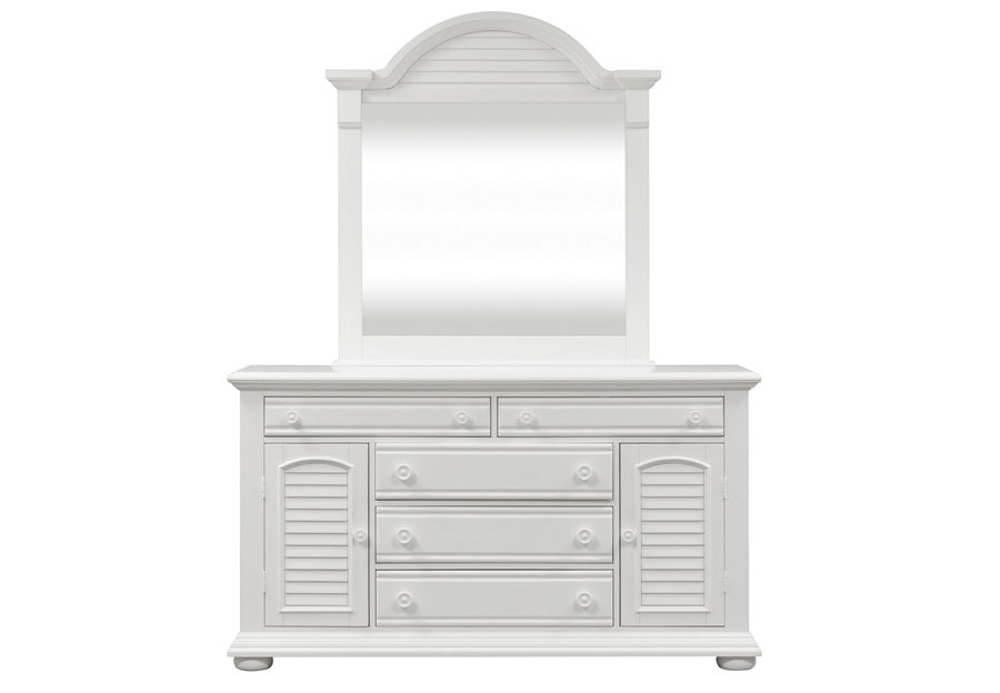 Invite the cottage style Summer House panel bed into your room. The oyster white finish is accented by louvered panels and arched crown molding, adding to the cottage charm. Made of pine and poplar solids, this bed features bolt-on rails and a center supported slat system, making this a sturdy and reliable bed.